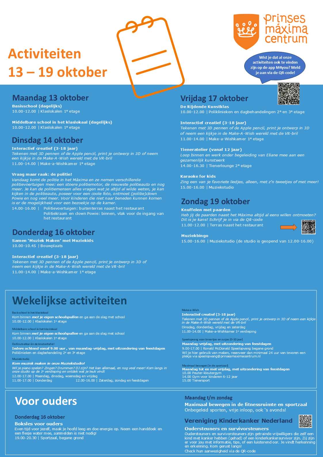 Here you find an overview of the activities for children in the Princess Máxima Center this week. Please note this flyer is in Dutch.