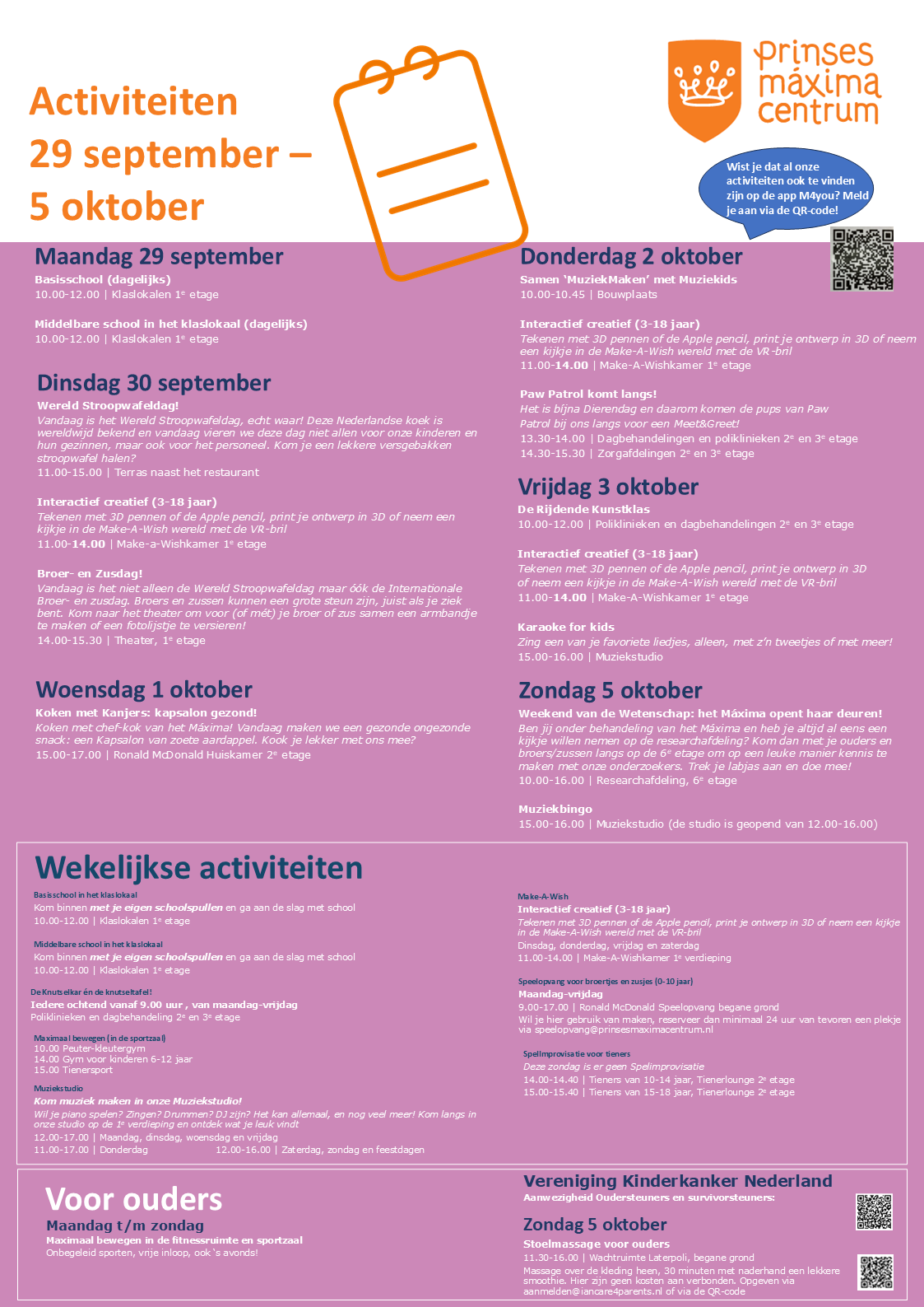 Hier vind je een overzicht van de activiteiten die deze week plaatsvinden in het Prinses Máxima Centrum.